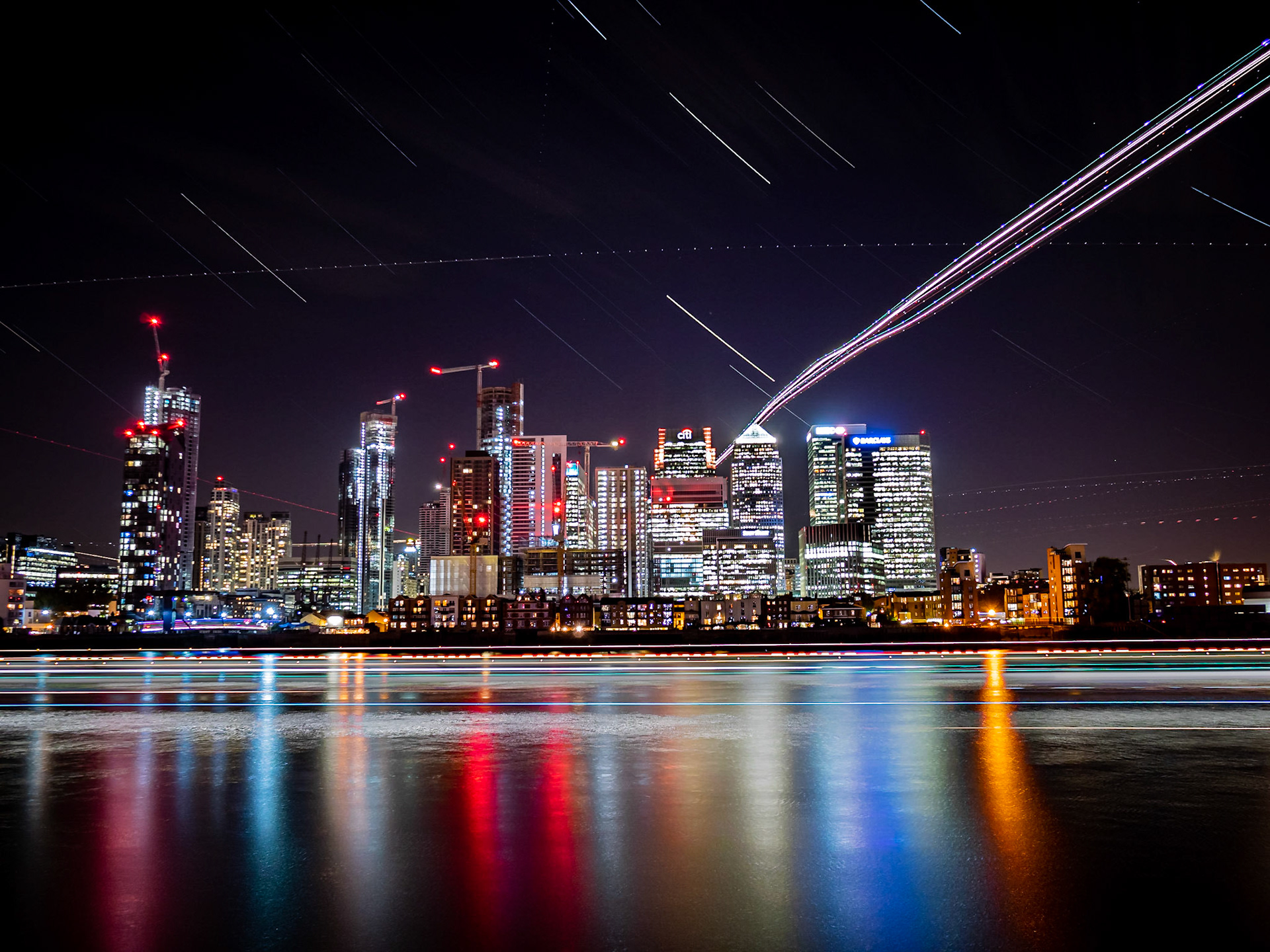This enthralling image of Canary Wharf is captured through a single 30 minute exposure. It captures the stars, aircraft taking off from London City airport along with the river boats, as you wouldn't have seen before.